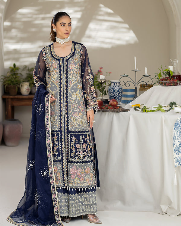 2-Organza embroidered dupatta with pearls embellishment completes the look with a touch of sophistication