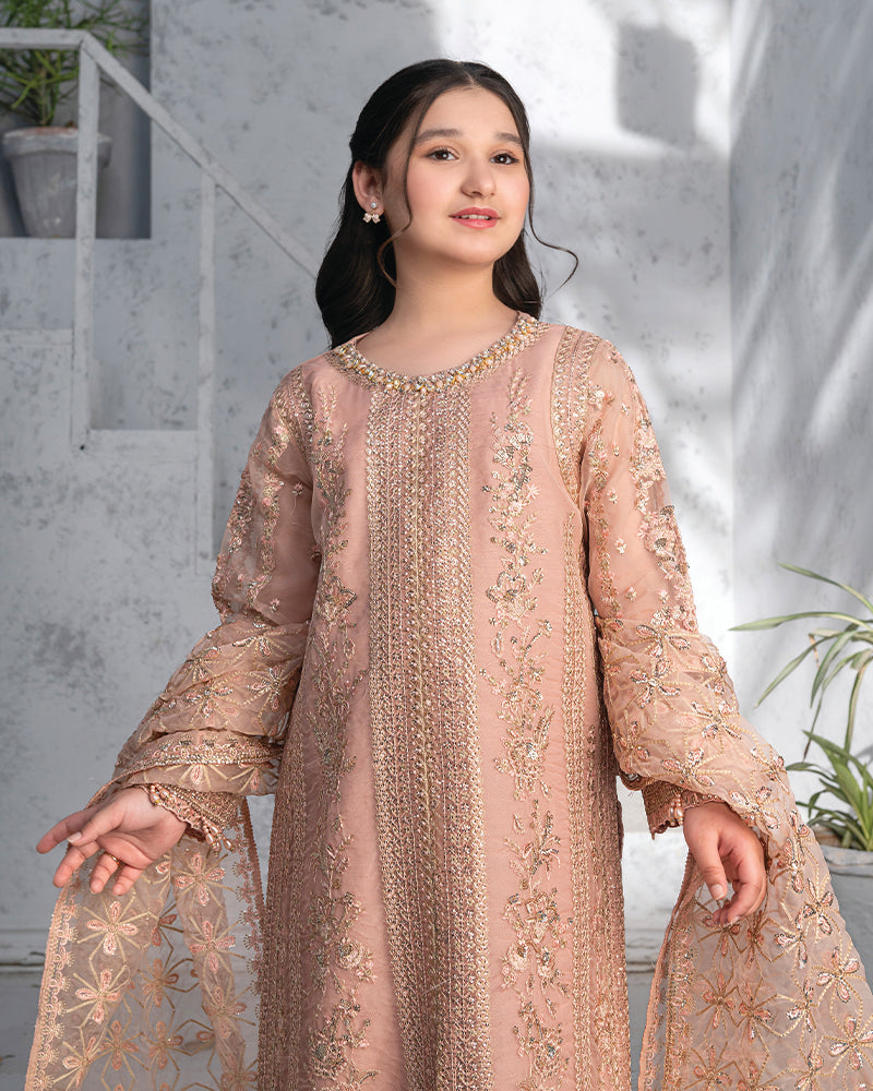| Organza shirt adorned with sequins, embroidery, tilla thread, pearls, and crystals. Organza dupatta is elegantly embellished with sequins embroidery, tilla thread, and delicate lace Complete the look with the viscose panel plazo |