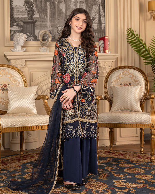 It’s paired with a delicate net dupatta featuring elegant lace details.
