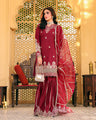 Additional Description: 1-Behold the exquisite cotton jacquard shirt, adorned with shimmering sequins and intricate mirror work 2-Paired with a luxurious organza dupatta, embellished with delicate embroidery and sparkling sequins, finished with elegant laces 3-complete the ensemble, the cotton ghararah, lavishly adorned with embroidery. A truly stunning and opulent outfit fit for royalty.