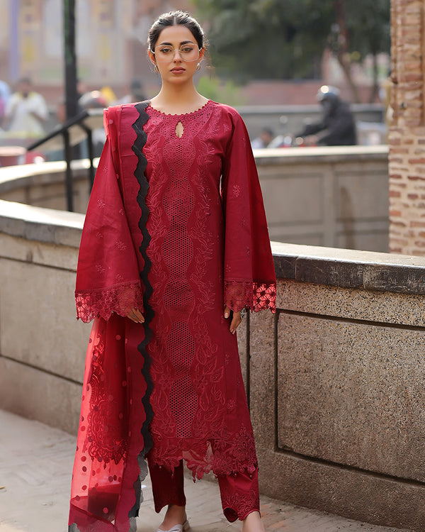 | Cotton chikankari shirt features intricate embroidery and delicate hanging pearls Net dupatta is adorned with a beautiful screen print and scalloped borders Cotton embroidered trousers featuring scalloped detailing |