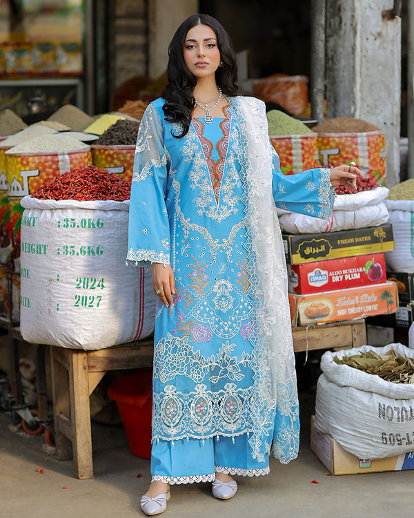 | Cotton Chikankari shirt, meticulously crafted with crystal embellishments and hanging stone tassels Organza Burnout embroidered dupatta features intricate cutwork borders and pearls embellishments Cotton trousers adorned with delicate lace detailing. |