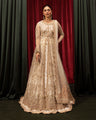 Net front open maxi crafted with intricate embroidery, shimmering crystal chainwork and delicate pearls,further enhanced by naqshi detailing and elegant brooches. The attached screen printed inner adds touch of elegance to ensemble.
