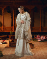 Additional Description: 1-Our signature 'uffrah' takes craft work on a new interpretation exquisitely designed organza peplum featuring intricate dabka chain work, delicate pearls, silver leaves, and gotta patti embellishments. 2-levate your ensemble with a stunning net dupatta featuring foil printing, embellished with pearls, sitara, and intricate Banarsi lace detailing. 3-Korean raw silk panel shararah, meticulously crafted with delicate pearls, silver leaves, sitara, and gotta patti embellishments. Elevate your style with this stunning piece.