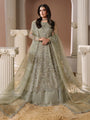Organza maxi adorned with intricate sequin embroidery, handcrafted adda work, naqshi dabka work, cutdana stones, chainwork, crystals, and 3D floral embellishments.