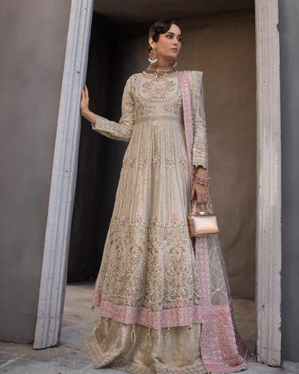 Additional Description: 1-Net embroidered maxi enhanced with hand crafted ada work 2-Net dupatta with embroidered borders 3-Viscose trouser